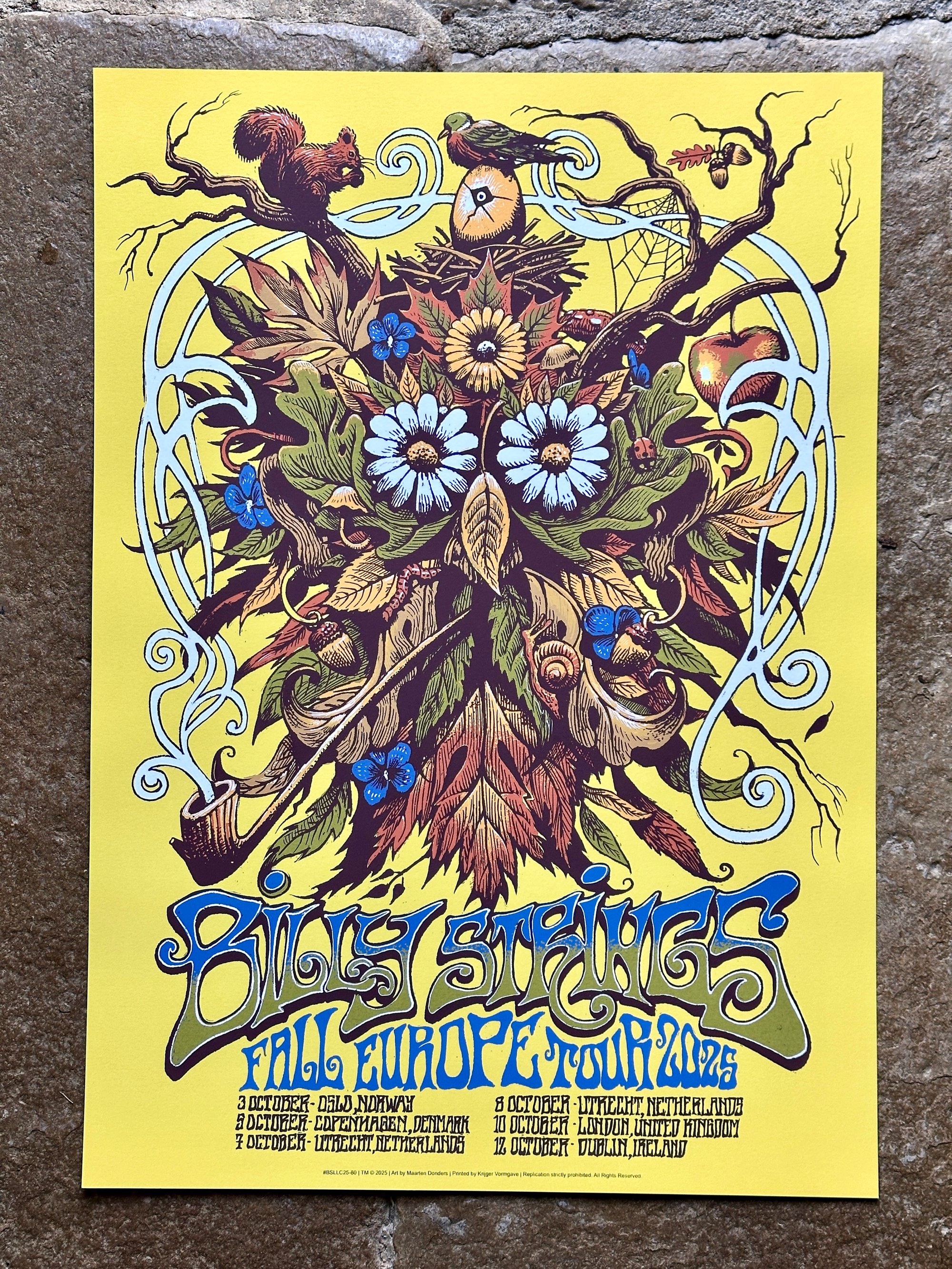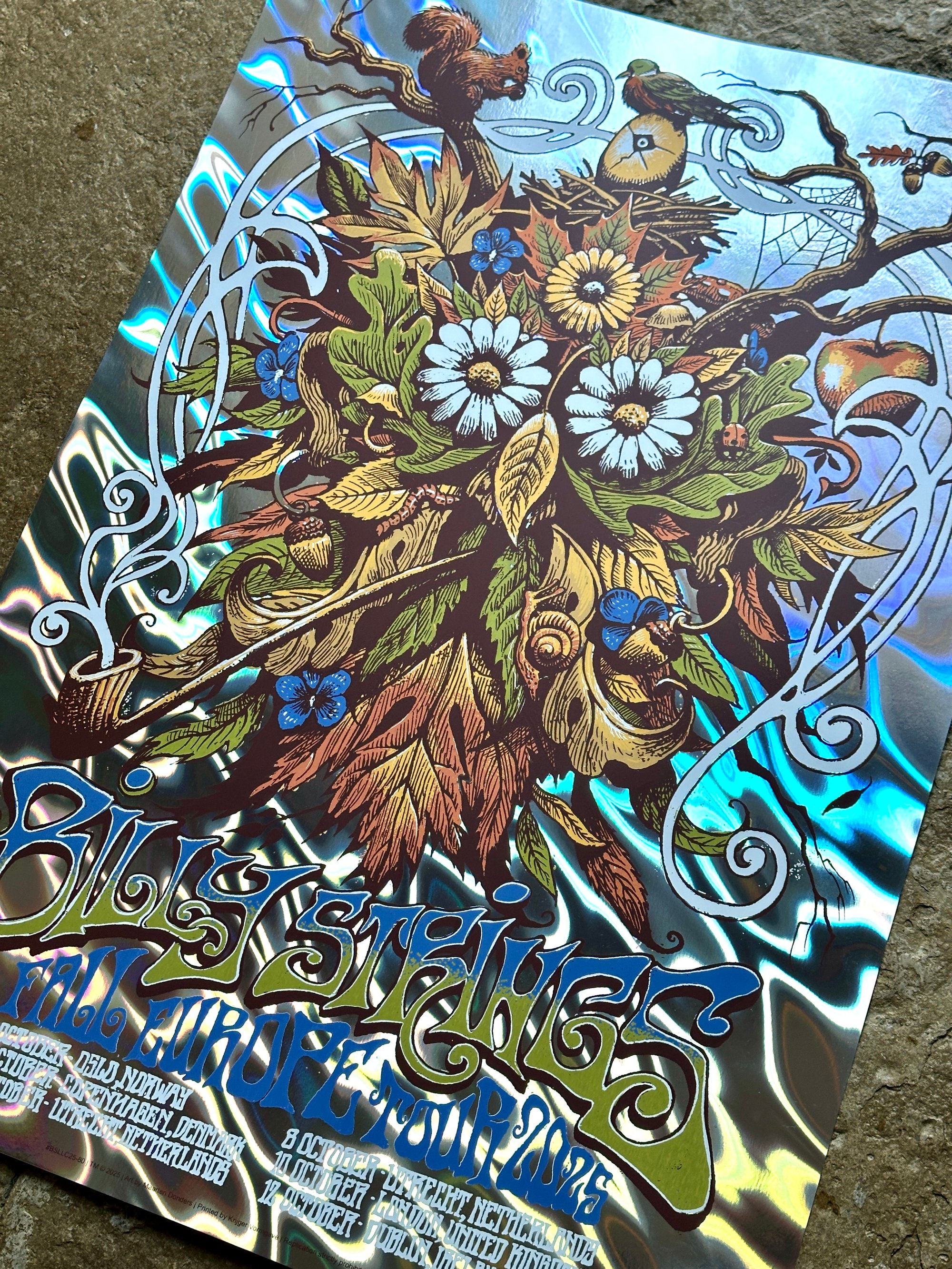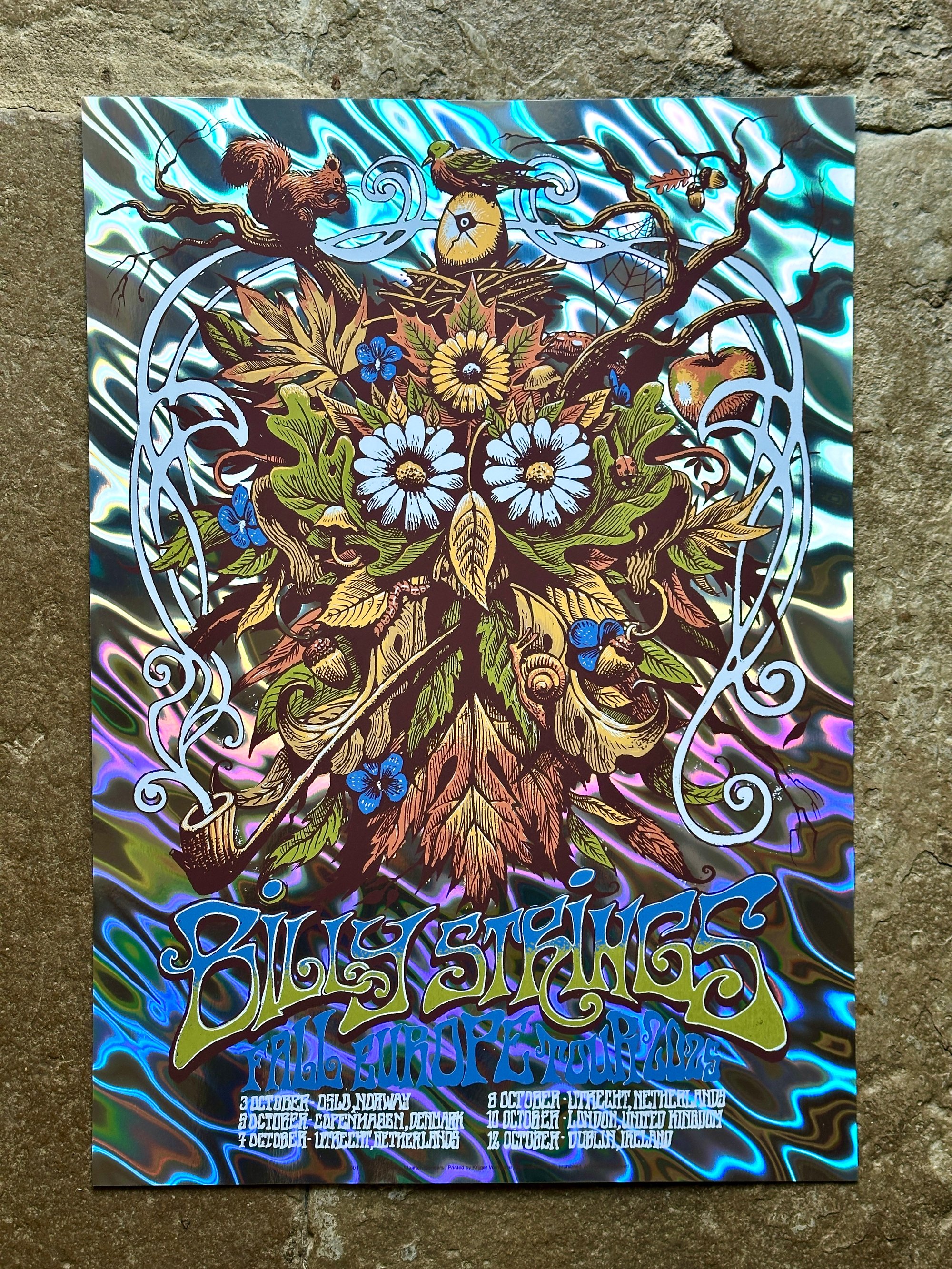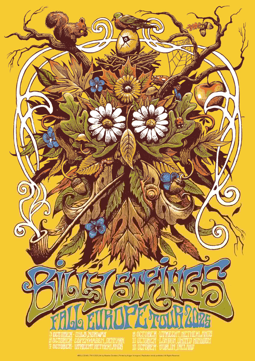 These are the artist proofs of the screenprinted poster I designed for Billy Strings' 2025 Europe tour.